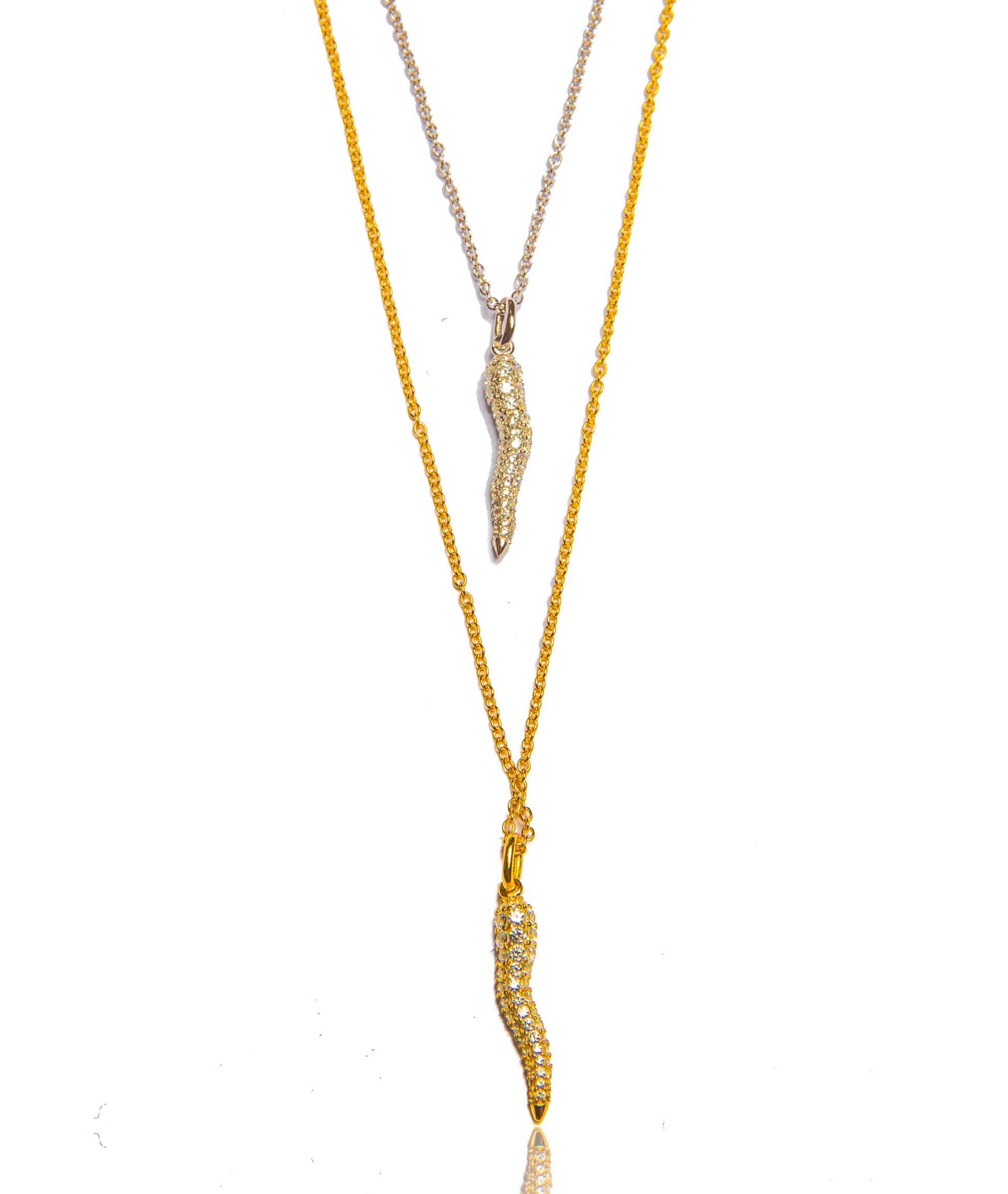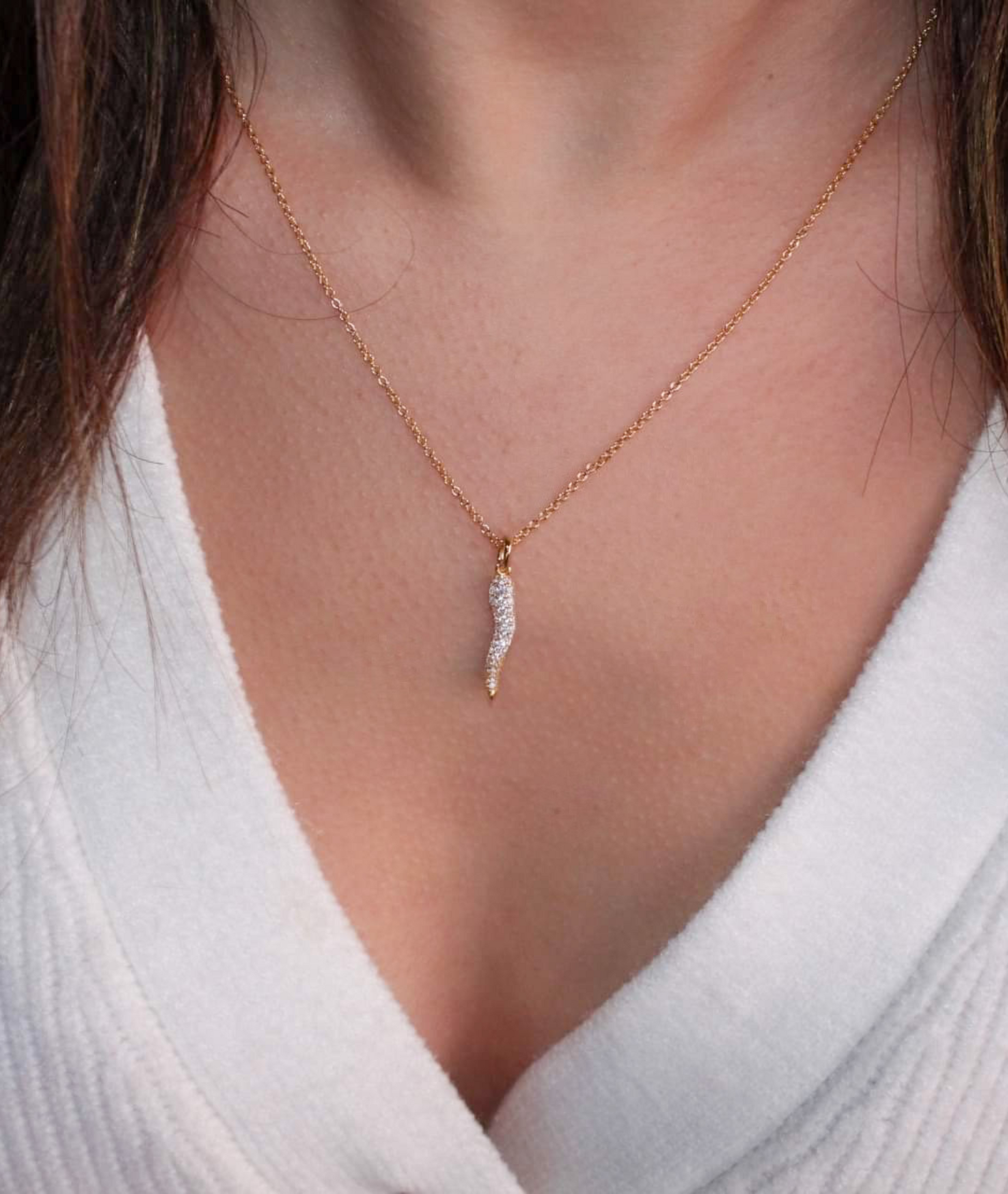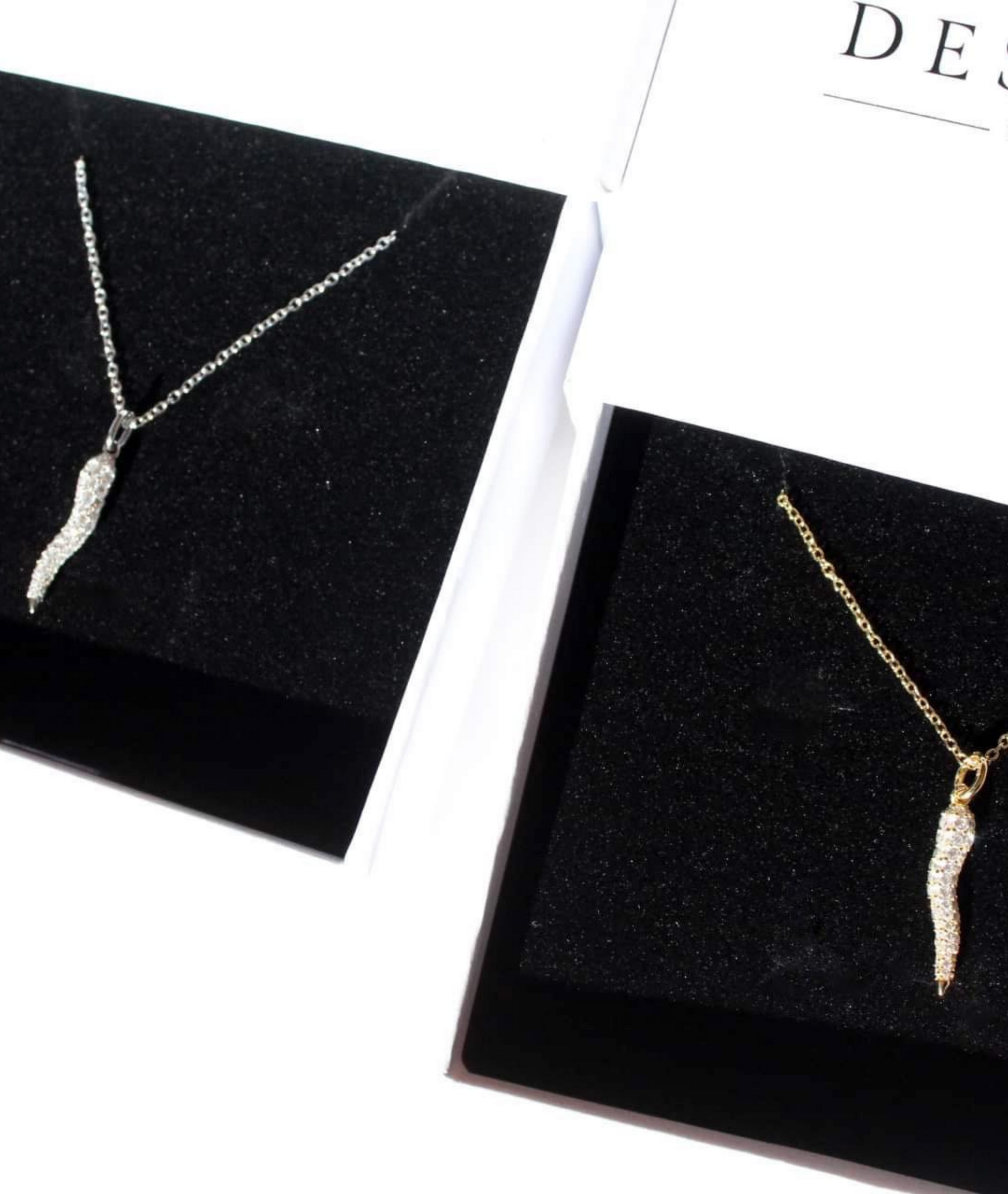 Sparkle with our new 'Diamante Cornicello Necklace' available in Sterling Silver or Gold Plated. This beautiful piece is dripping is diamantes that wrap around the whole charm.