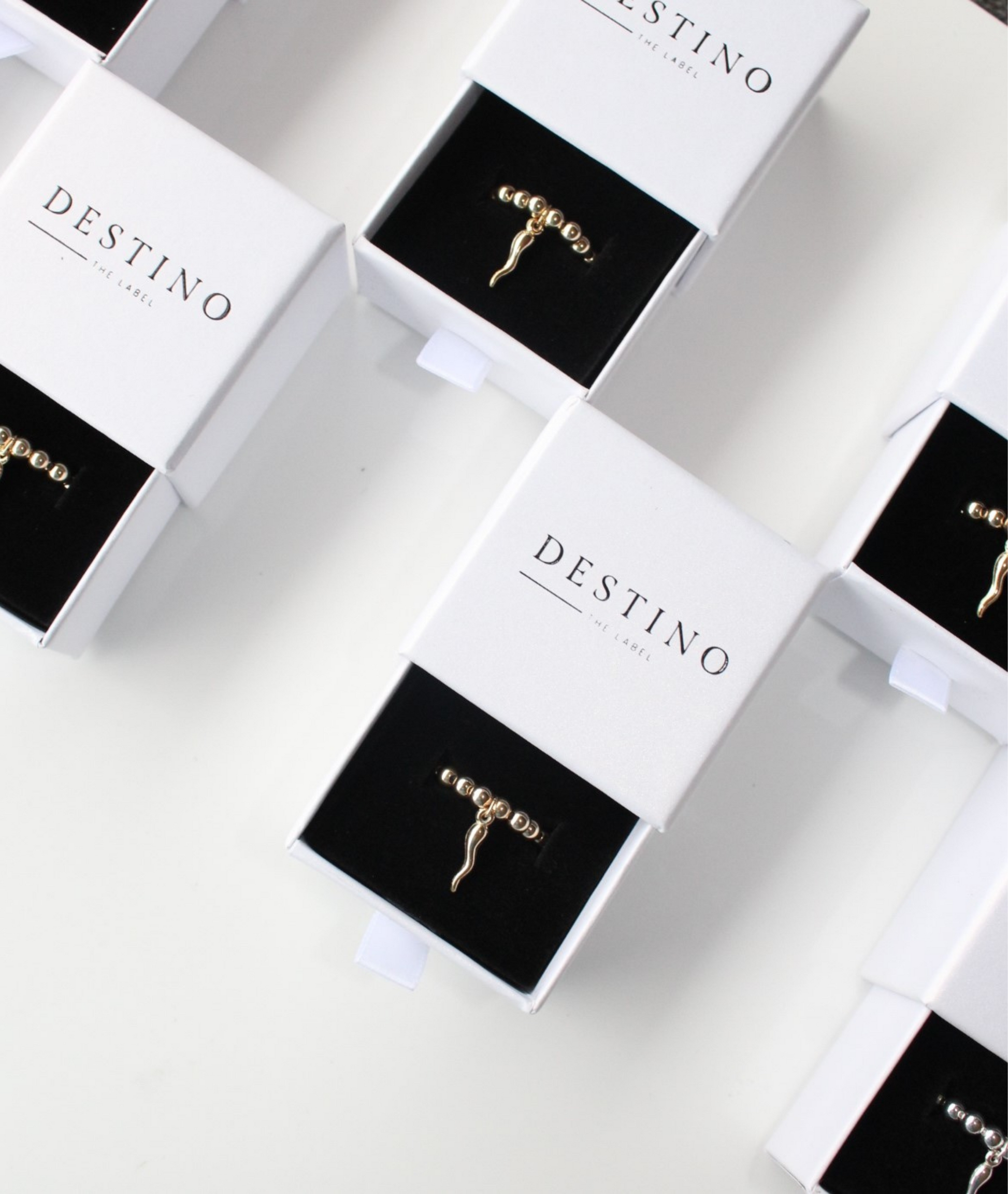 - All Jewellery Pieces come with a Microfiber Cleaning Cloth & a Destino The Label Keepsake Jewellery Box